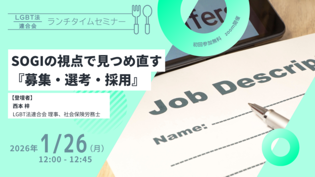 1月のランチタイムセミナーは、「SOGIの視点で見直す『募集・選考・採用』」をテーマに開催いたします。セクシュアルハラスメント防止対策の強化により、採用・面接の場面においても、求職者の尊厳を侵害しない対応が事業主に求められています。SOGIに関する認識不足や無意識の思い込みが、意図せず排除やハラスメントにつながることも少なくありません。本セミナーでは、採用活動全体を通じて生じやすい課題を取り上げながら、SOGIの視点から、事業主として注意すべきポイントを解説します。
