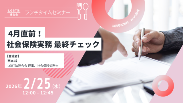 2月のランチタイムセミナーは、「4月直前!社会保険実務 最終チェック」をテーマに開催いたします。扶養の判断、育児休業給付の対象範囲、通称名使用や性別情報の取扱いなど、4月前に確認しておきたい実務論点を整理します。判断を誤りやすいポイントを明確にし、制度の理解を土台に、安心して相談できる職場づくりにつながる実務のポイントを解説します。